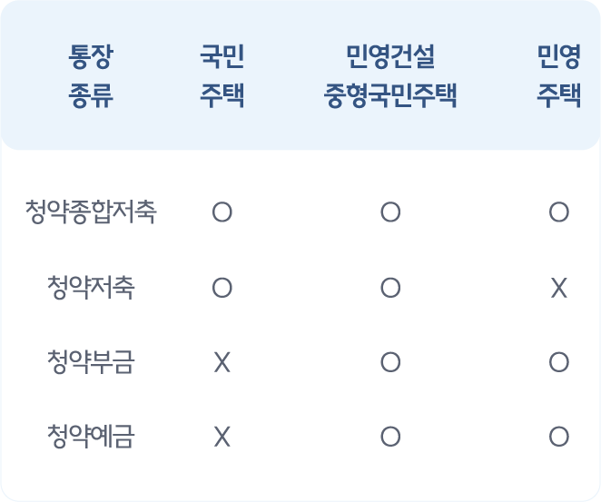 주택청약통장별 청약 가능한 주택 종류는 아래와 같습니다. 각 통장에 따라 청약할 수 있는 주택의 종류가 다르므로, 자신의 상황에 맞는 통장을 선택하는 것이 중요합니다.